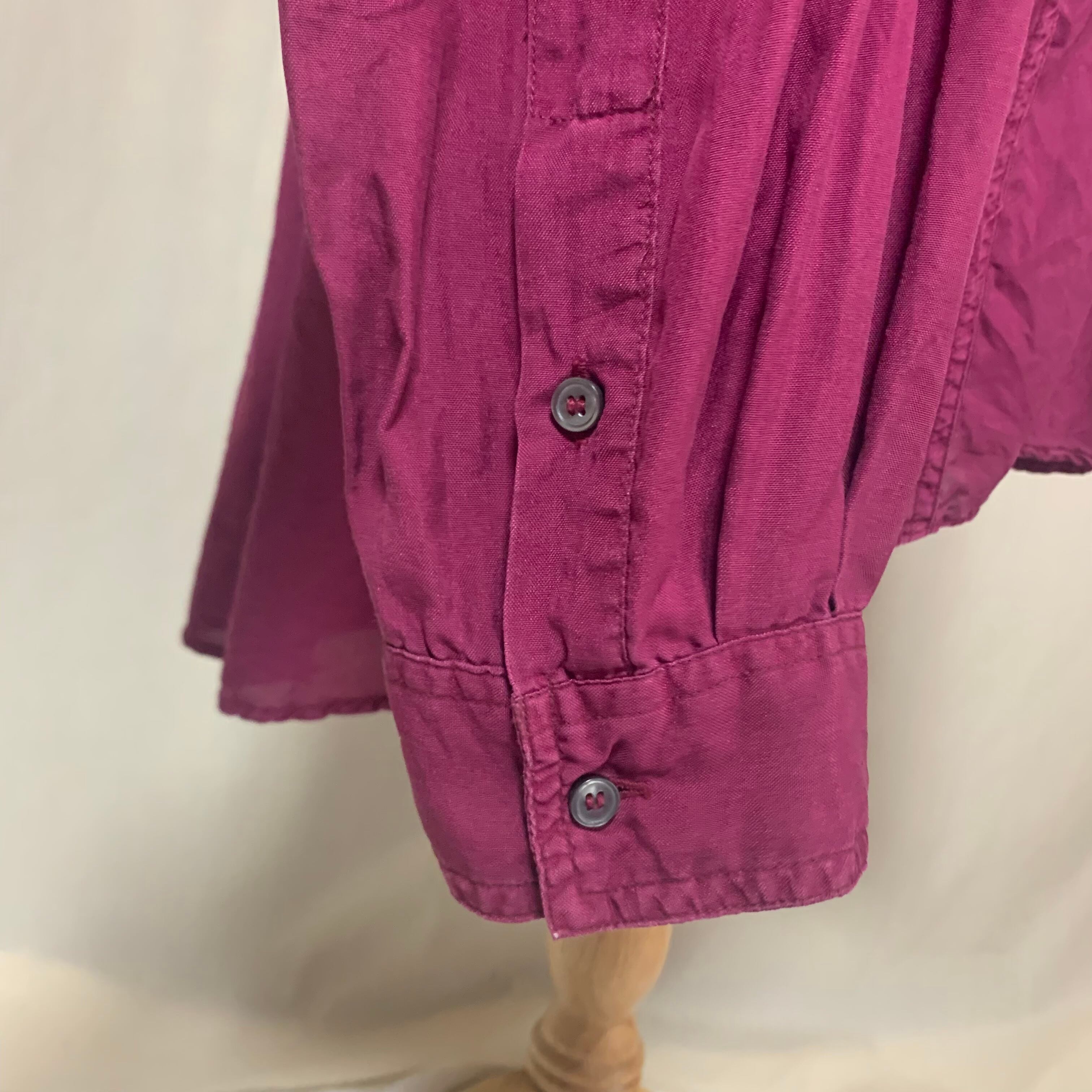 まるでブドウジュースのような鮮やかなパープルカラーが素敵なシルクシャツです。シルク素材で着心地が良くかなり薄手なので、羽織りはもちろんですが、ジャンパースカートなどを重ねて中に着るのもおすすめです。光沢感のある生地が上品な雰囲気です◎
