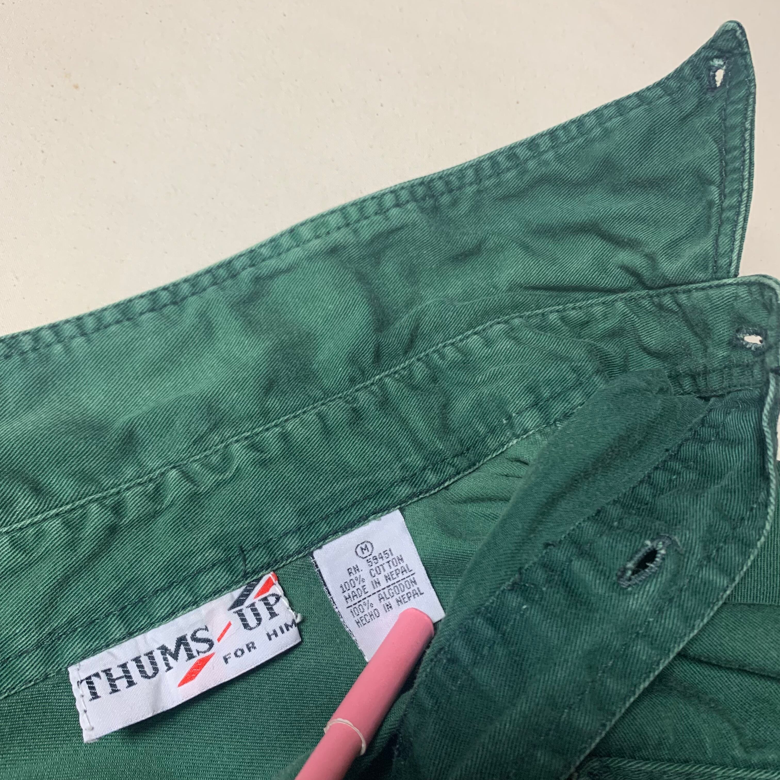 流行りの濃いグリーンカラーが可愛く、所々薄くなっている部分もありますが古着の風合いとして良い雰囲気です。デニムのような分厚すぎずでしっかりとした生地です。