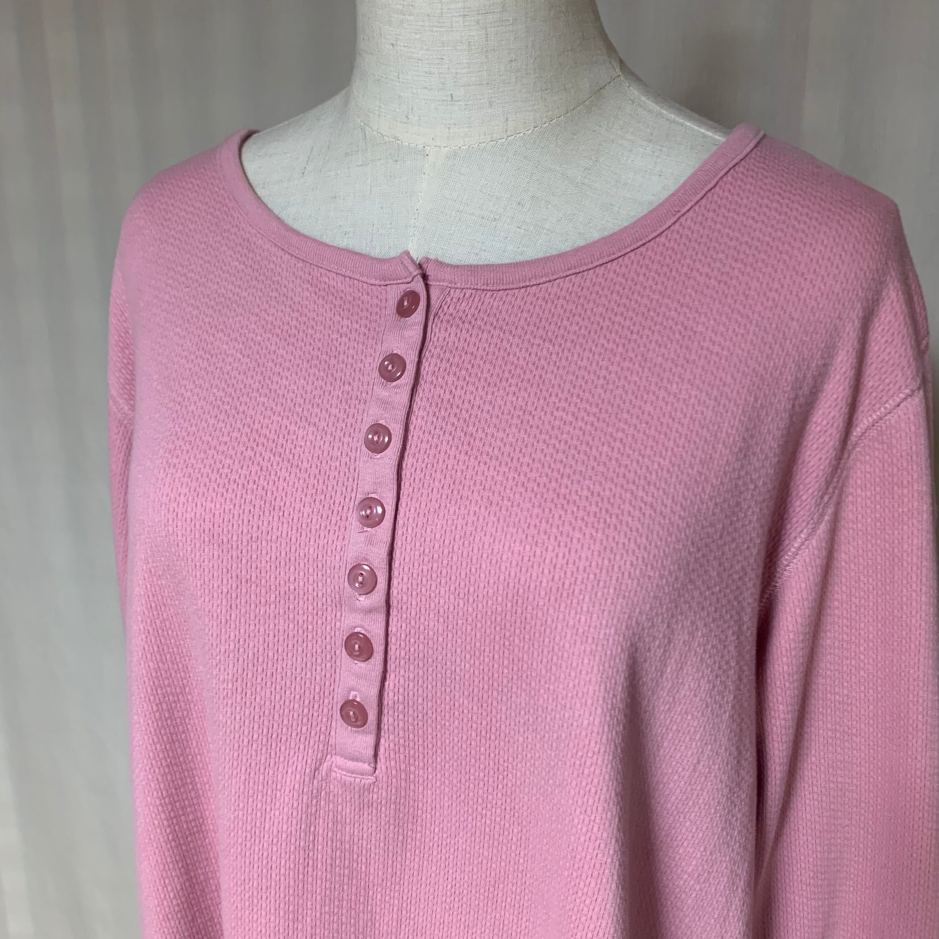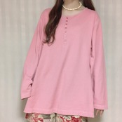 ふんわりピンクカラーが優しい雰囲気のサーマルカットソーです。フロントにたくさん付いたクリアピンクのボタンがポイント◎