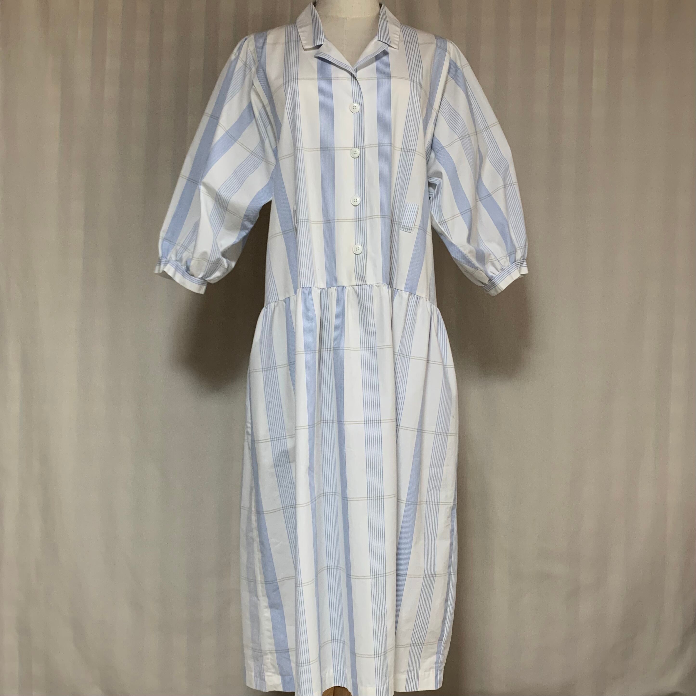 ◉フワットソラニマウチェックなワンピース◉古着 パフスリーブ 白 水色