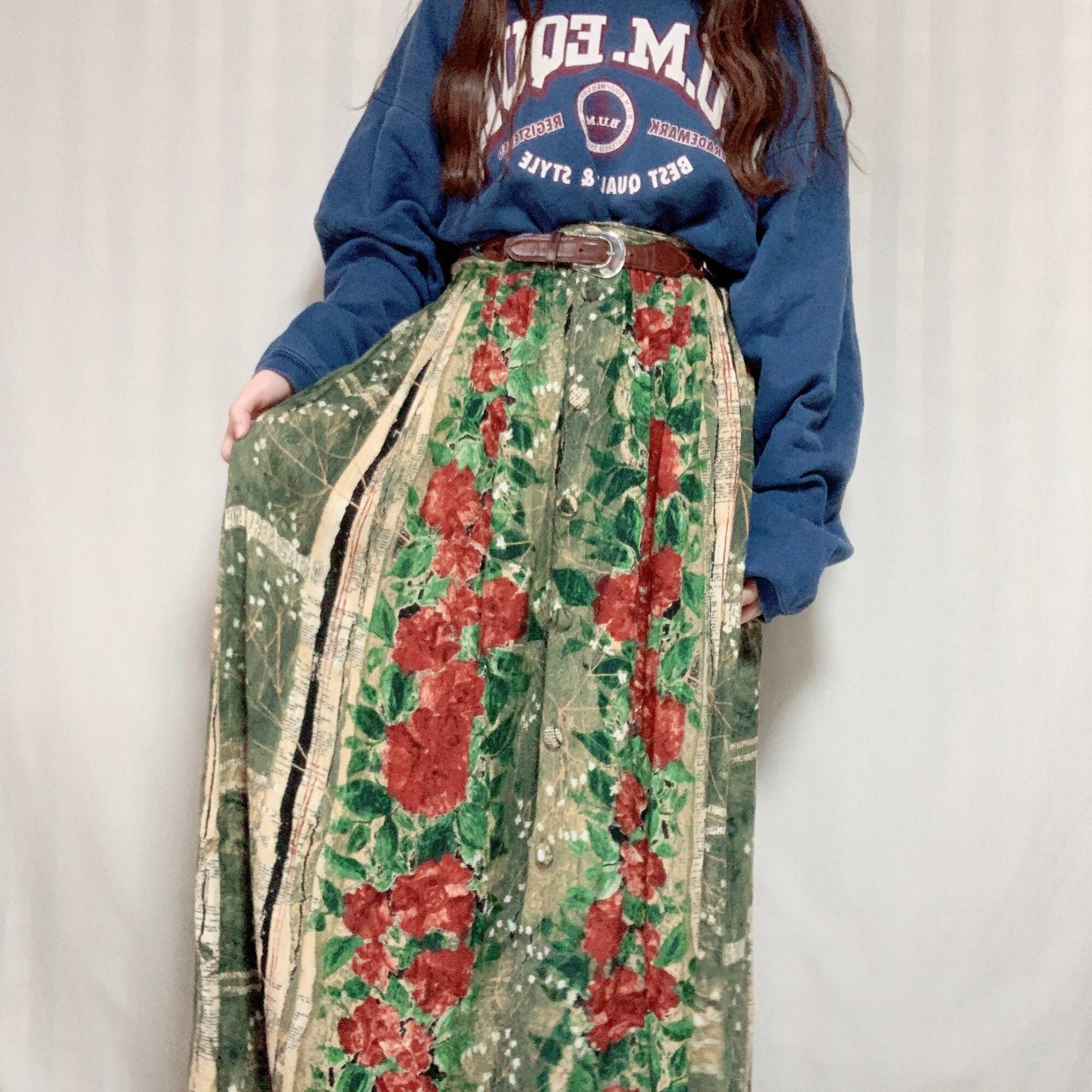 ヴィンテージな雰囲気漂う柄で古着らしいコーディネートにぴったりなスカートです。たっぷり使われた布とレーヨン素材の生地で動くとふわっとしなやかに揺れる感じも素敵です。フロントにあしらわれたくるみボタンもポイントです!