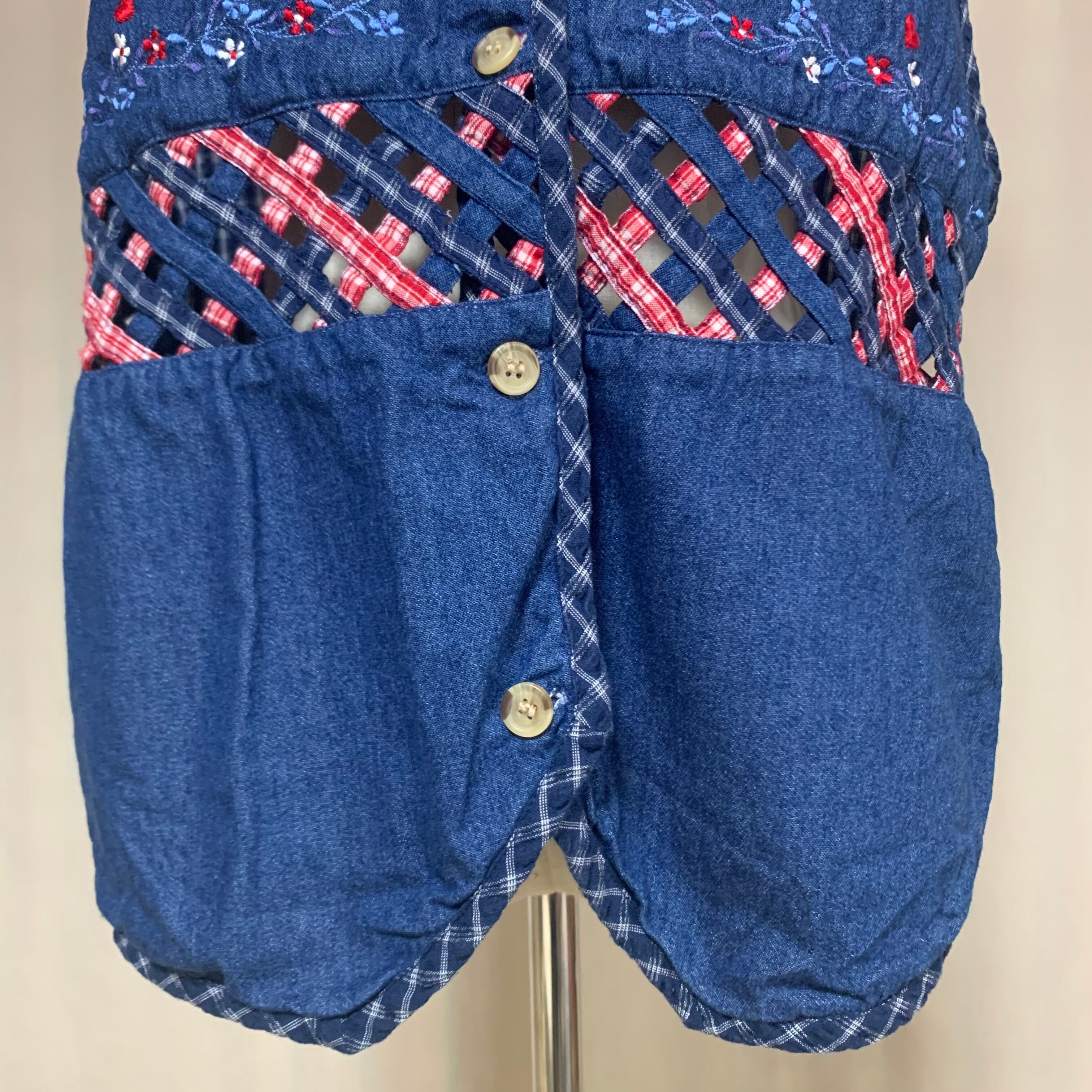 濃いデニムカラー×レッドの色合いが可愛いベストです!あみあみの切り返し部分がついているのがポイント◎中に着ているアイテムがちらっと見えて可愛いです。