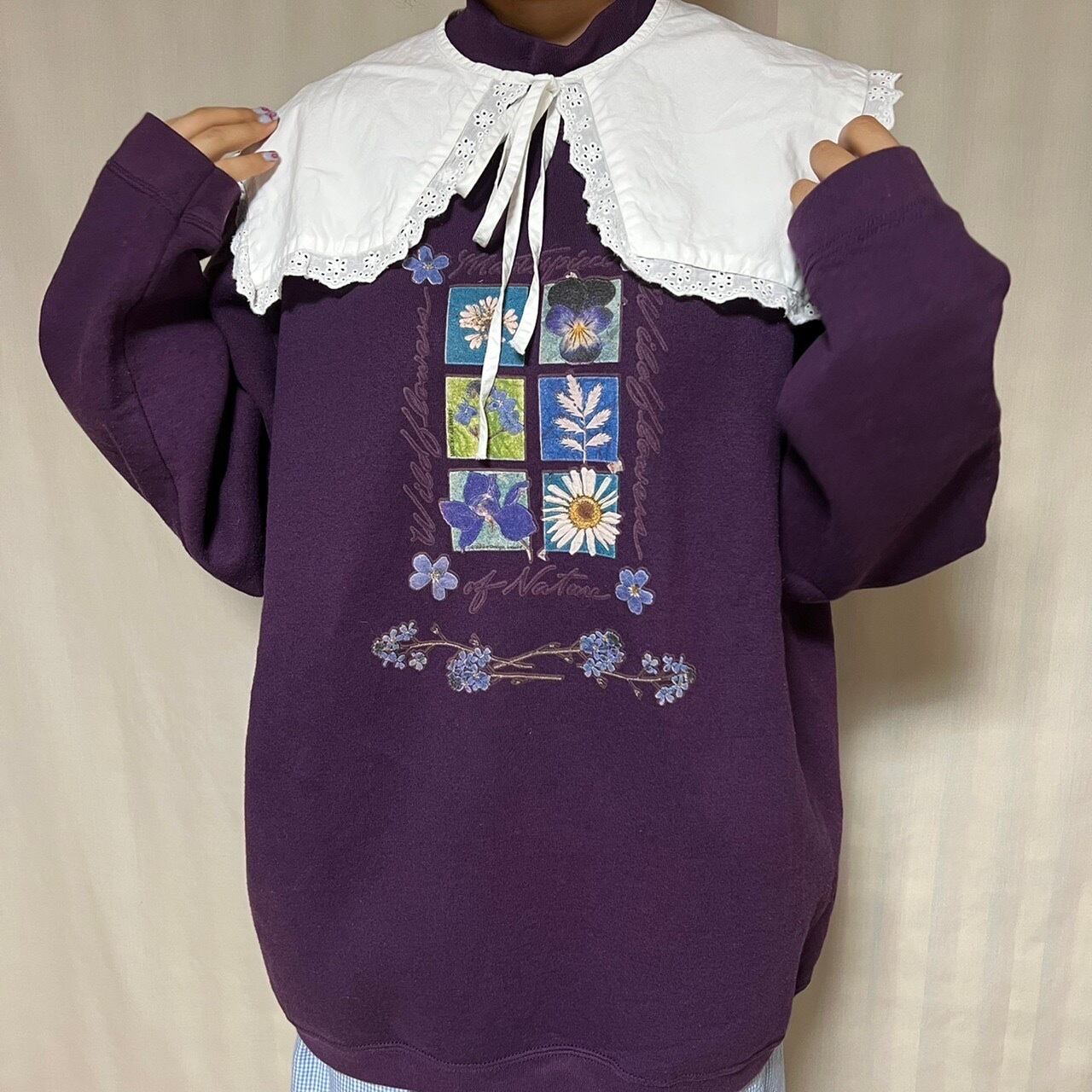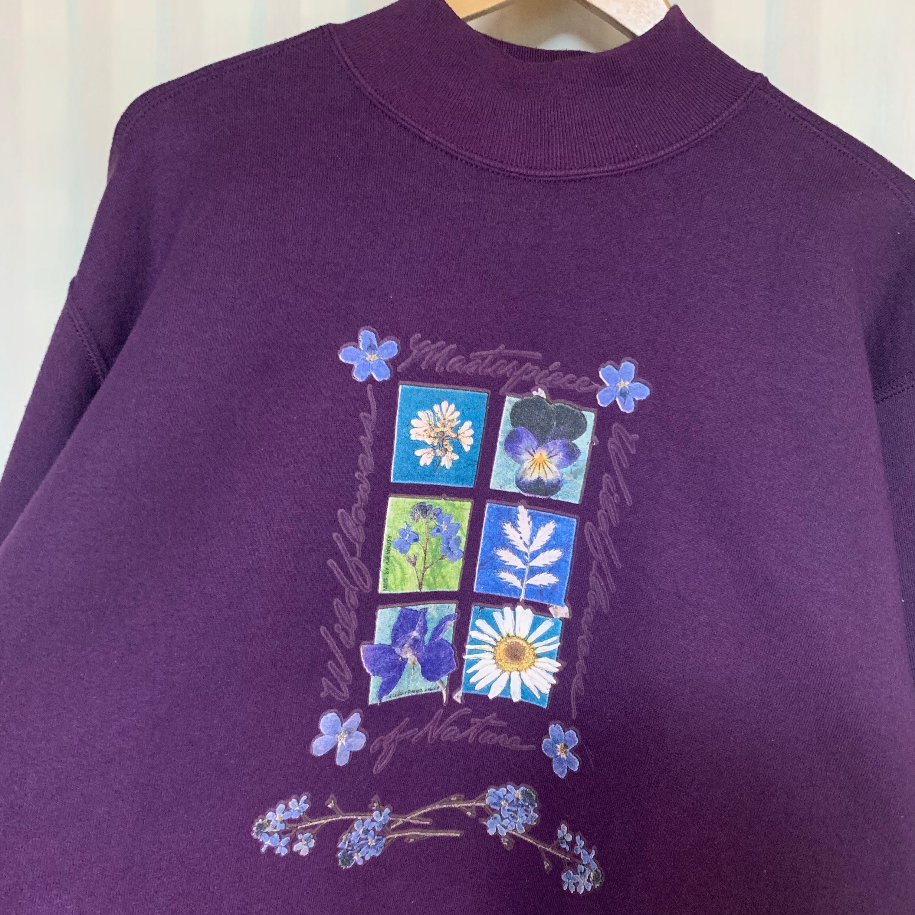 カントリー風なデザインのお花プリントが可愛いスウェットです。濃いパープルのボディに同系色のプリントでまとまりのある落ち着いた雰囲気です。