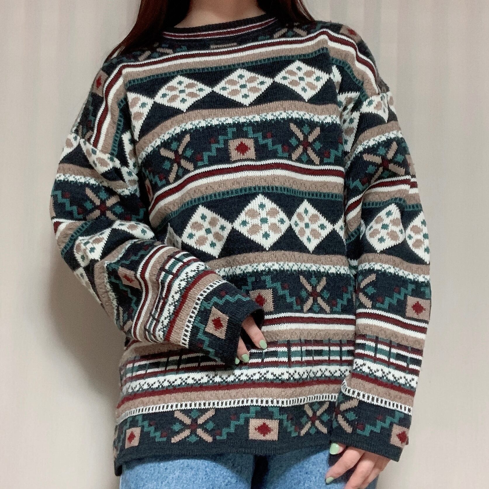クッキーのようなほっこりとした柄が可愛いニットです。カラフルですが落ち着いた色合いが◎