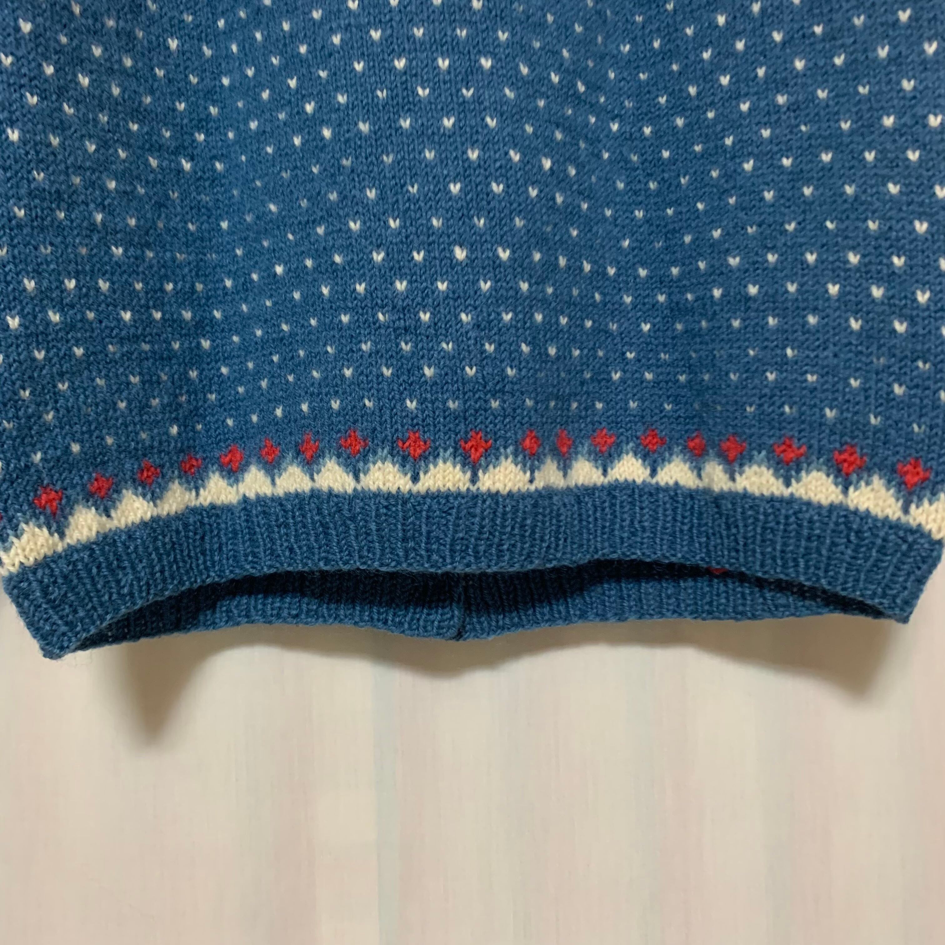 くすみブルーに白赤黄の色合いが可愛いノルディックカーディガンです。