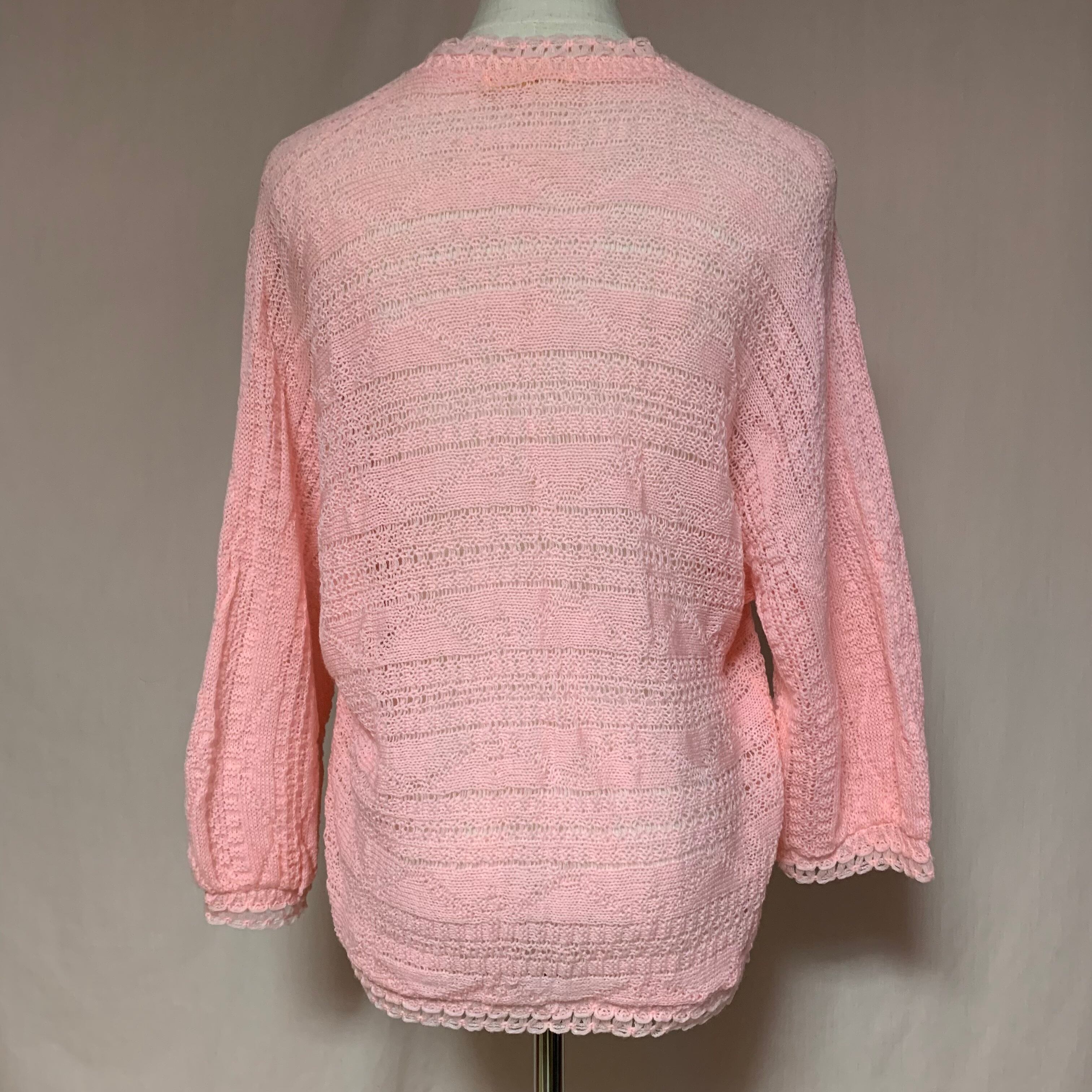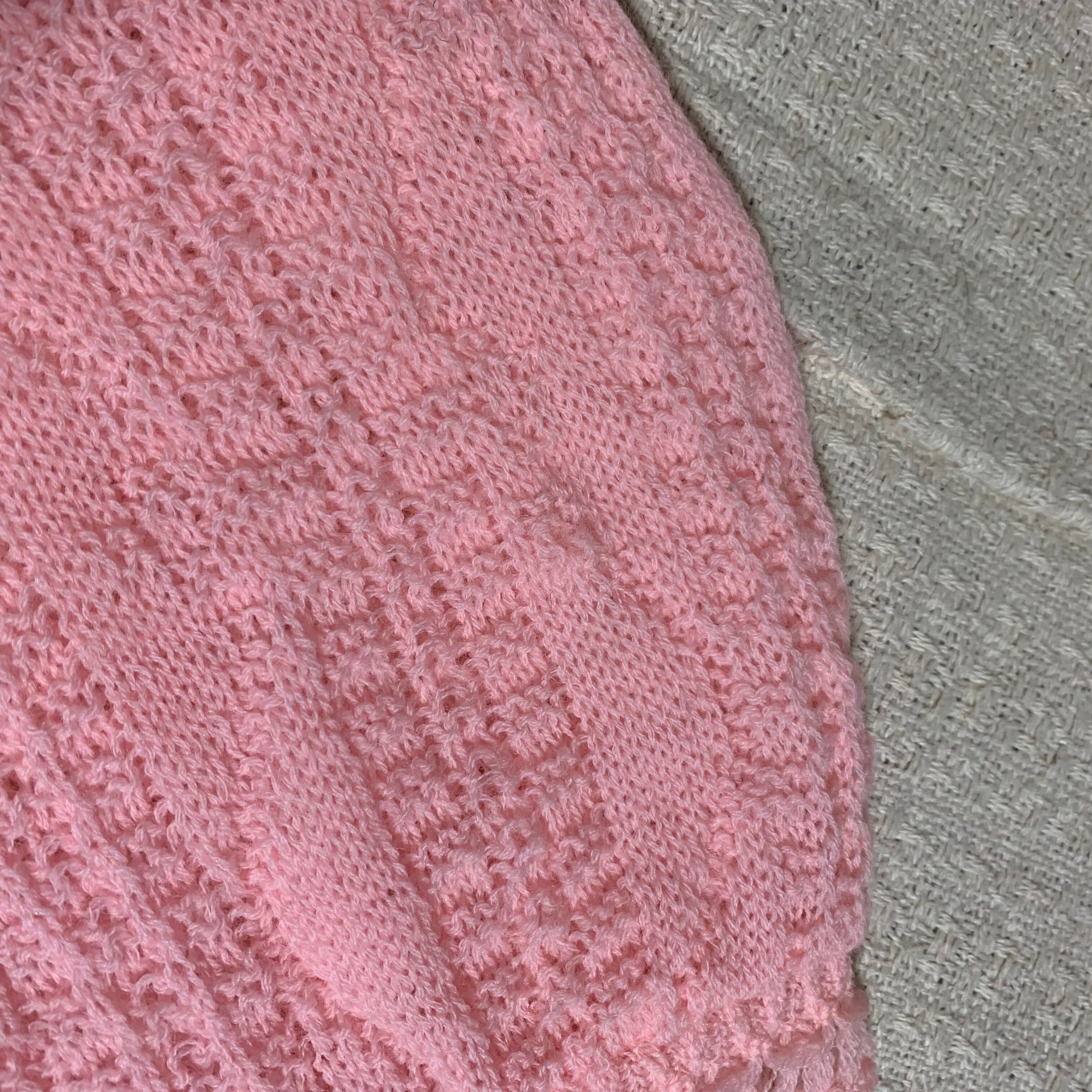 細かい編み模様やフリルのように編まれた裾や袖のデザインが何とも可愛らしいニットカーディガンです。60年代のハンドニットだと思われます。