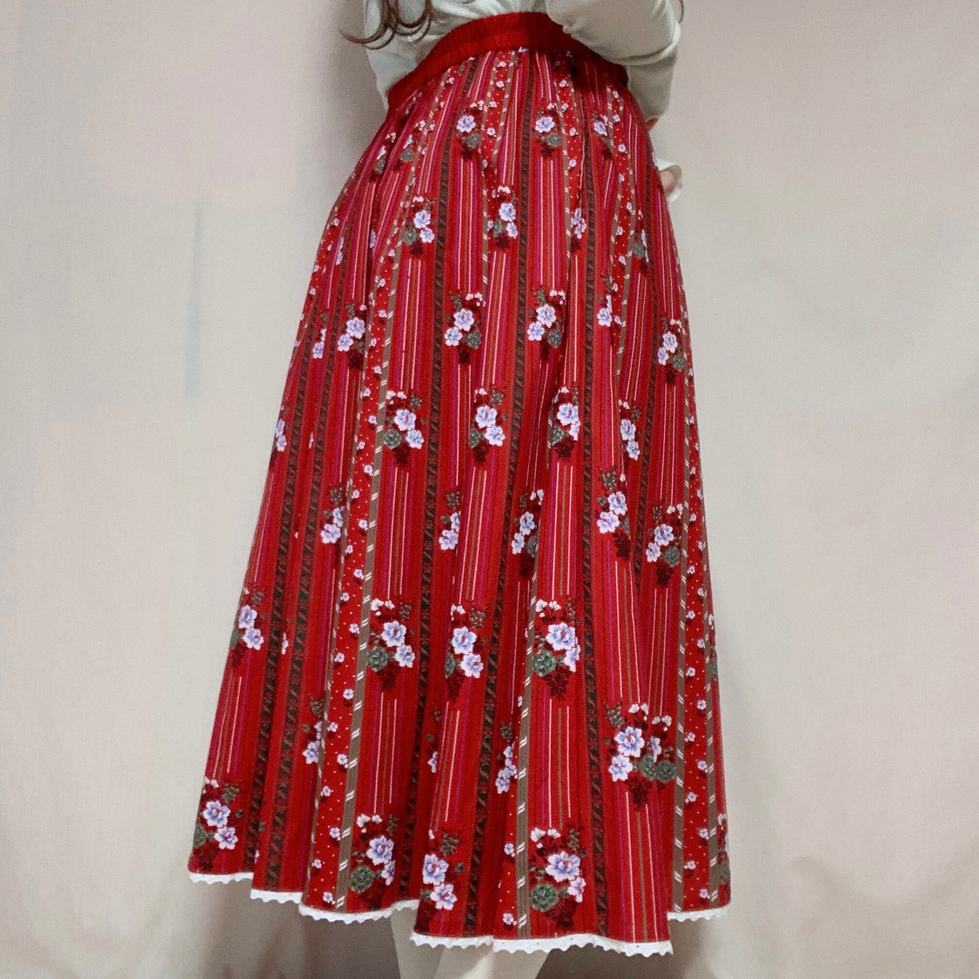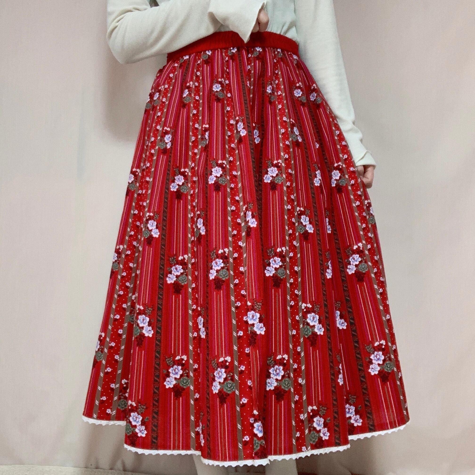 赤地にストライプとお花の柄が上品な可愛さのあるスカートです!