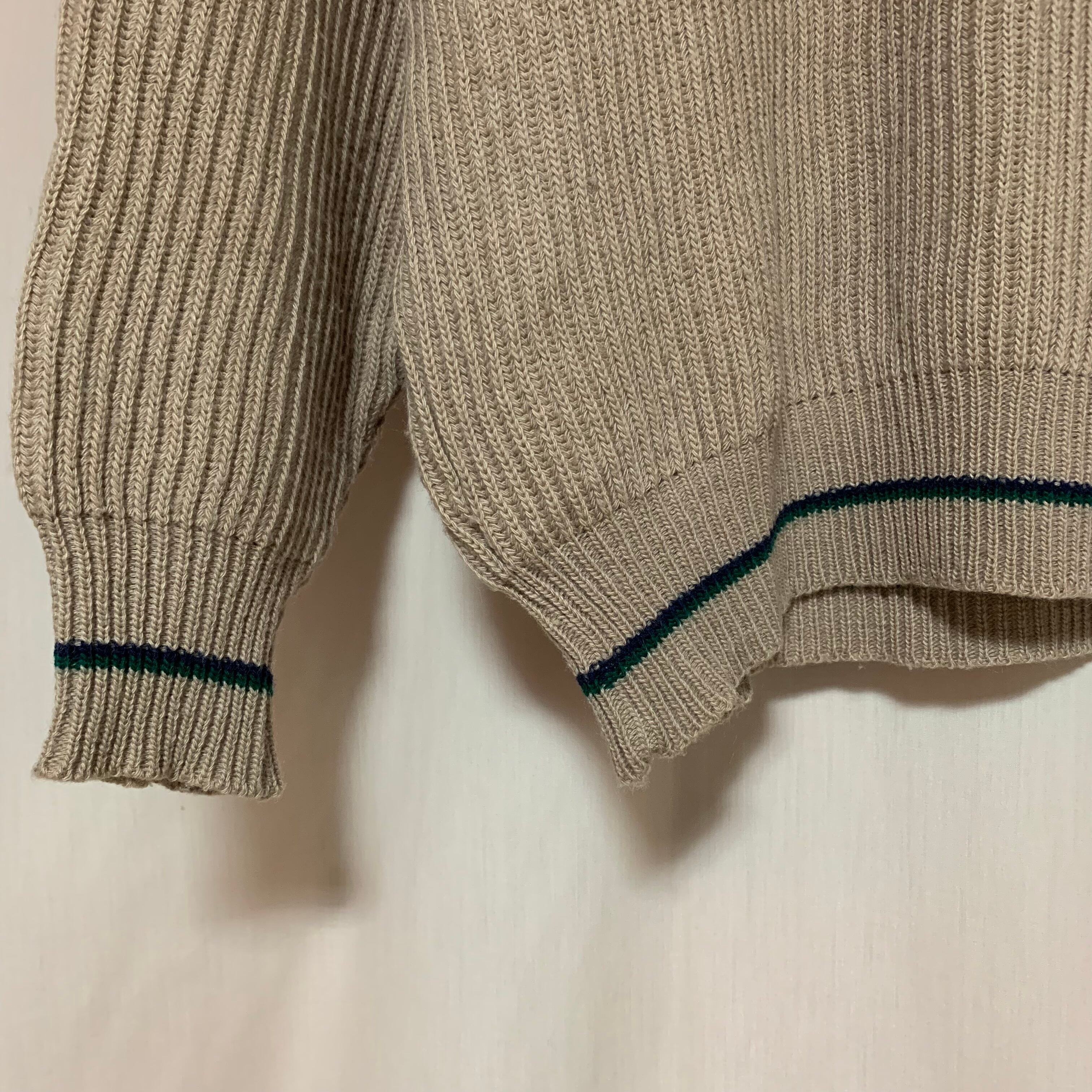 優しいベージュカラーにグリーンとブルーのラインがポイントのチルデンニットです。