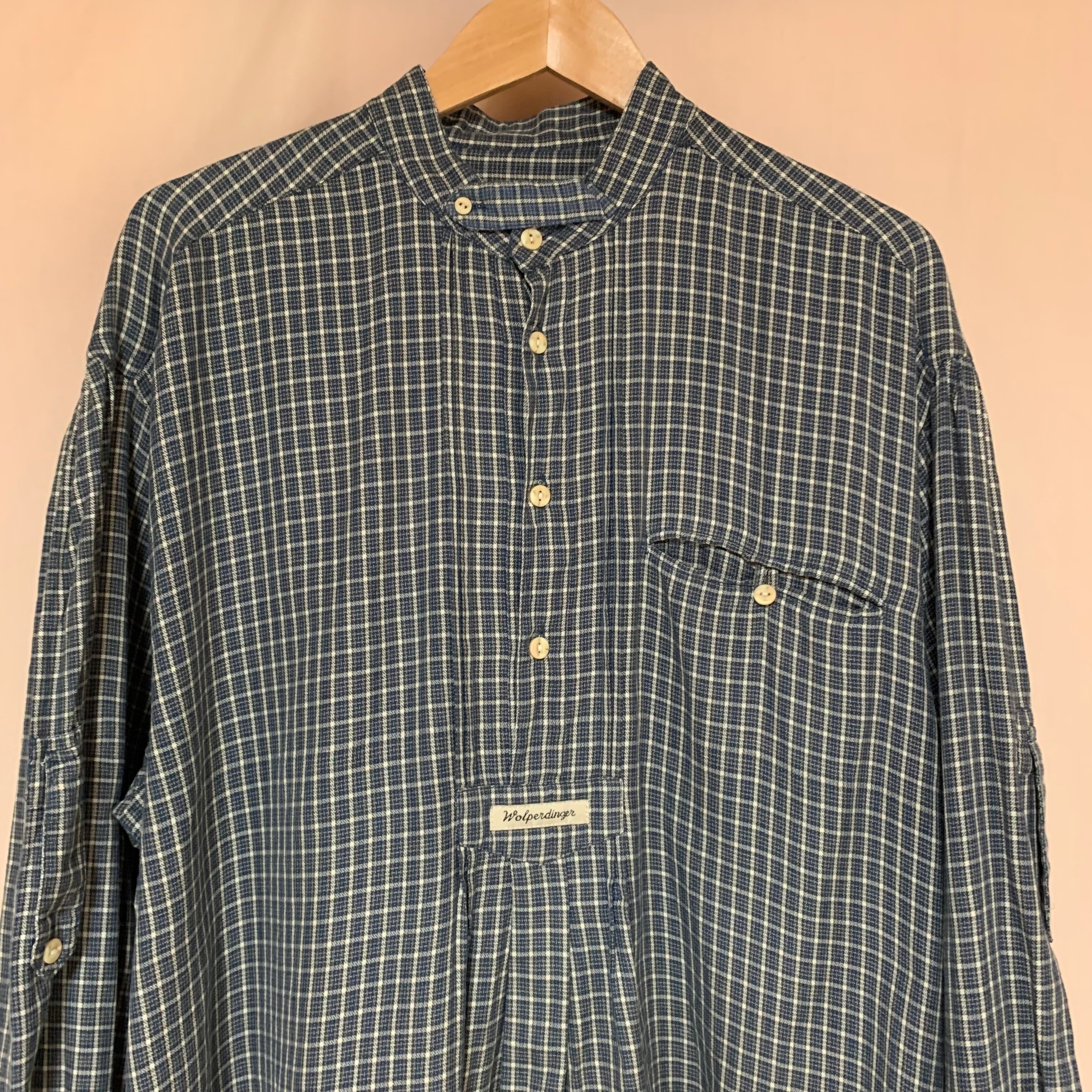 ネイビーブルーカラーに白黄黒の混ざったチェック柄のチロルシャツです。
