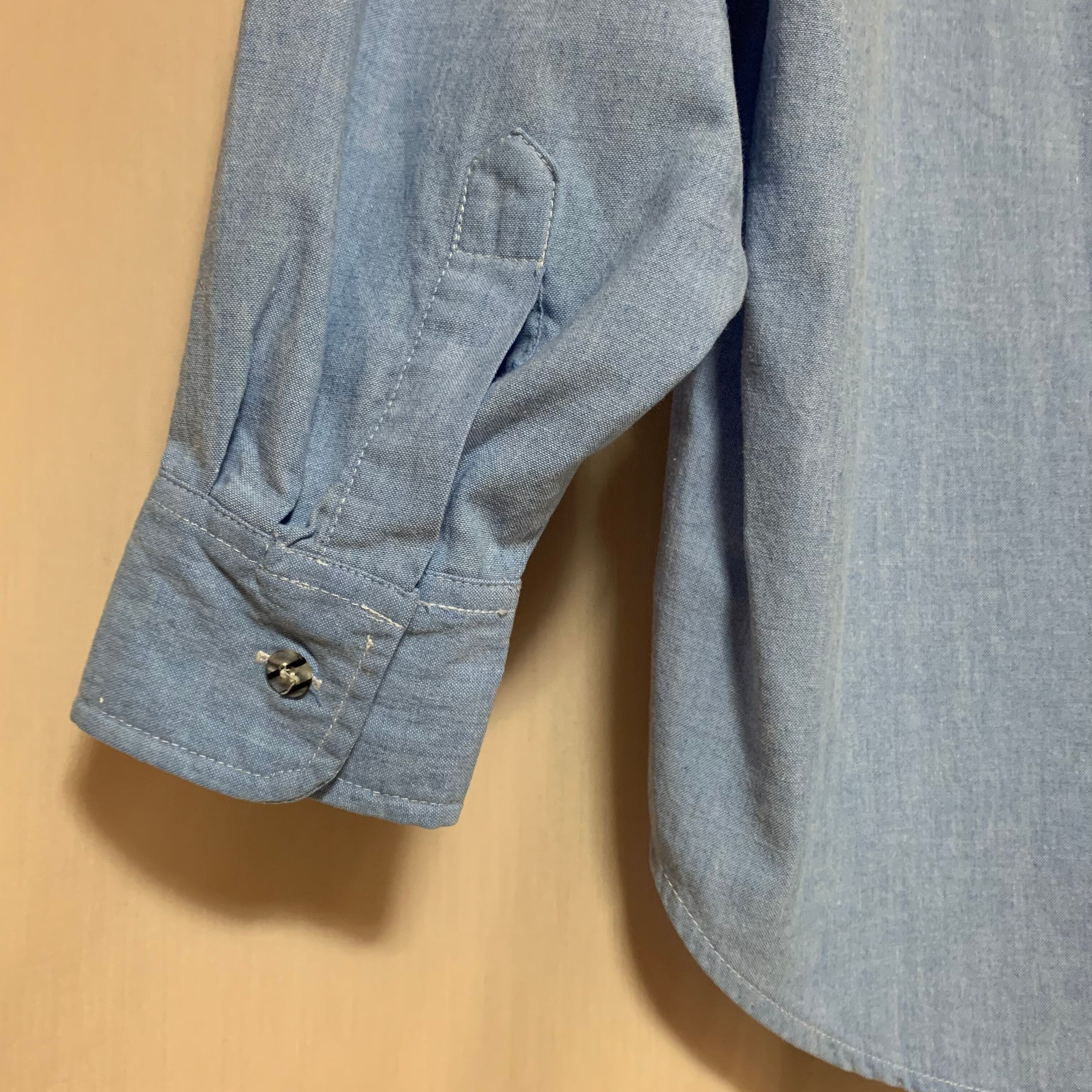 明るいカラーのデニム生地が爽やかな印象です。クリア素材でストライプ柄のボタンに細かいこだわりを感じます◎