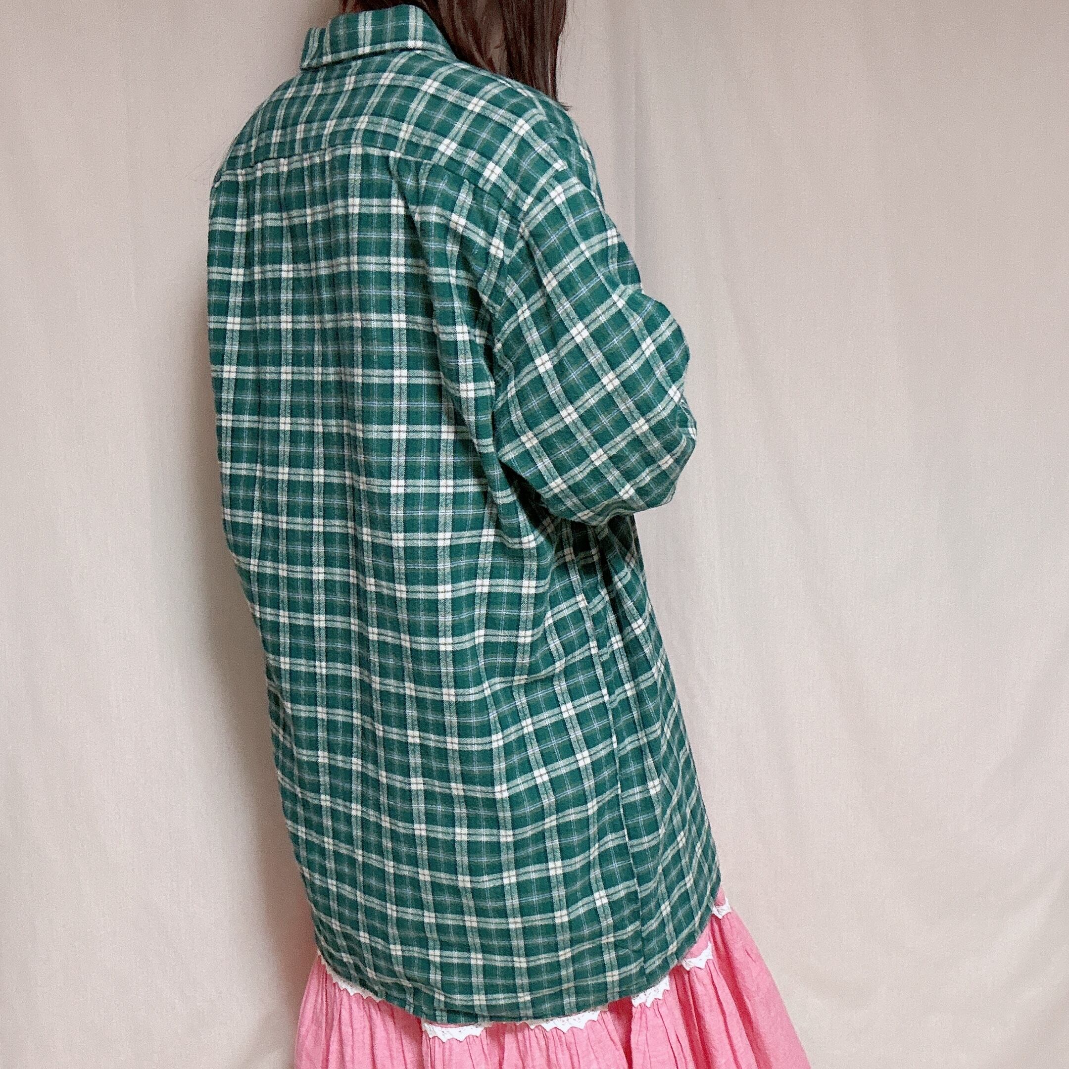 ◉サラダヲタベルアサのロングチェックシャツ◉ 古着 緑