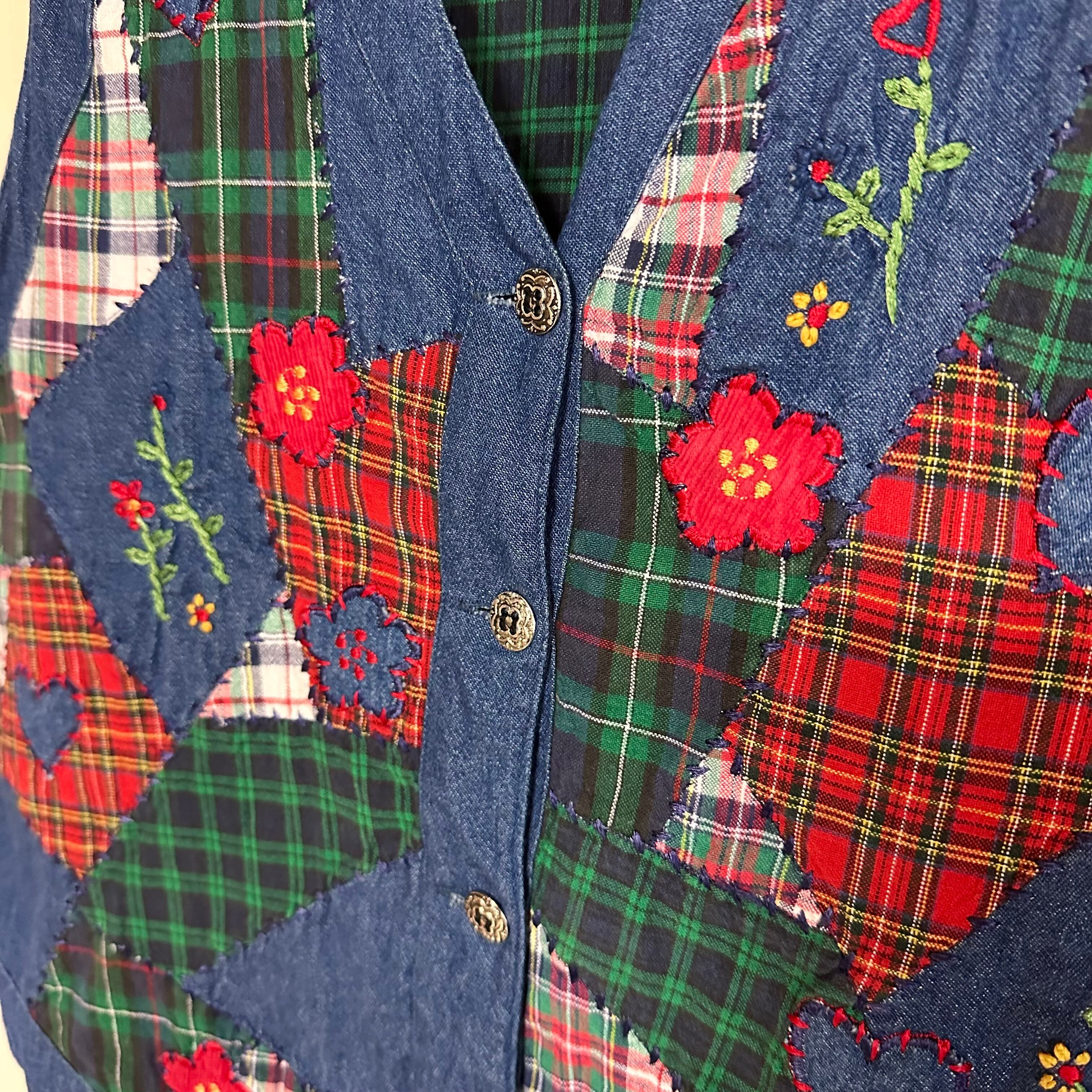デニムにチェックにお花やハートの刺繍に…可愛いものがぎゅっと詰まったベストです!華やかですが主張の強過ぎない落ち着いた色合いです◎