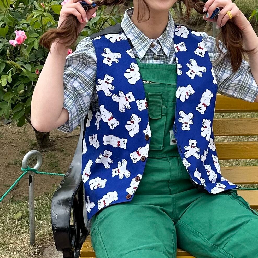 ◉アオシソラトシロイクマなベスト◉ 古着 青 くま ポップ