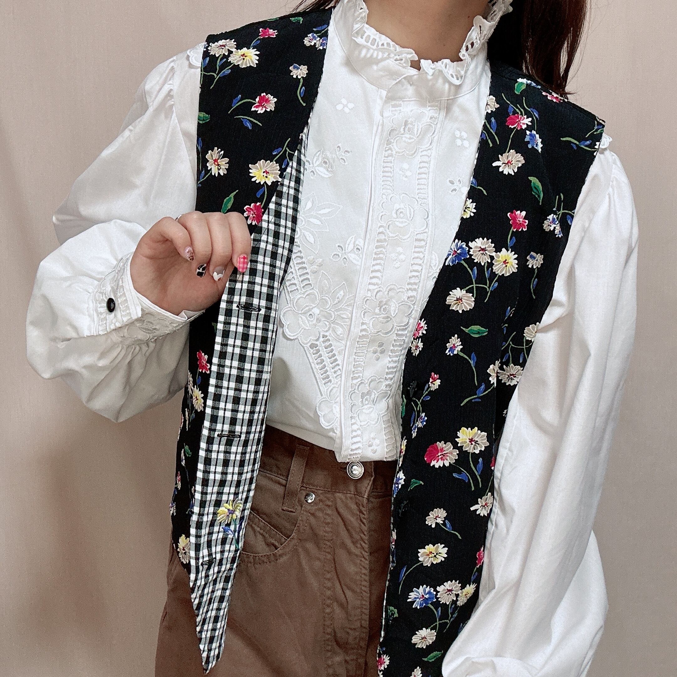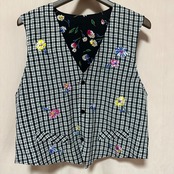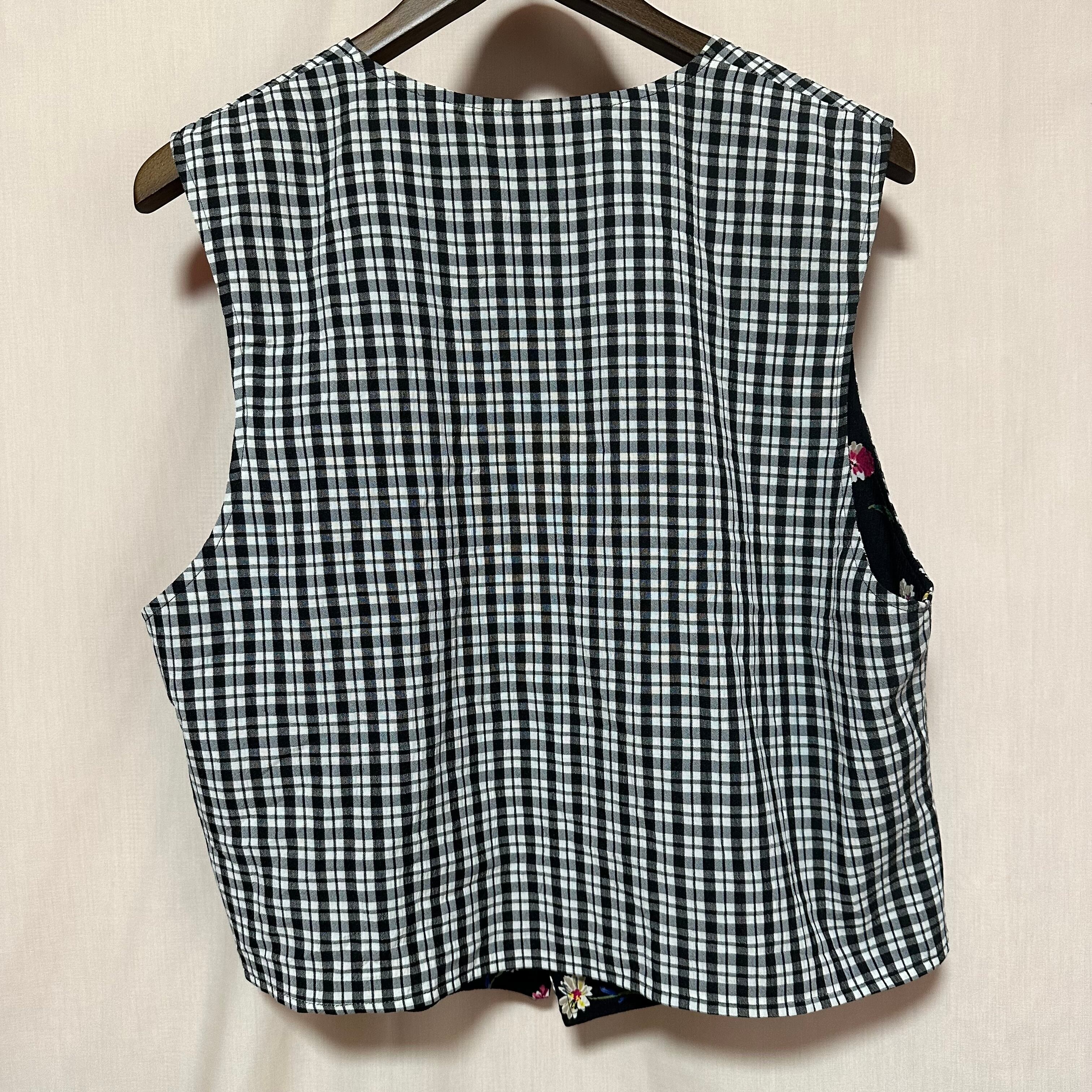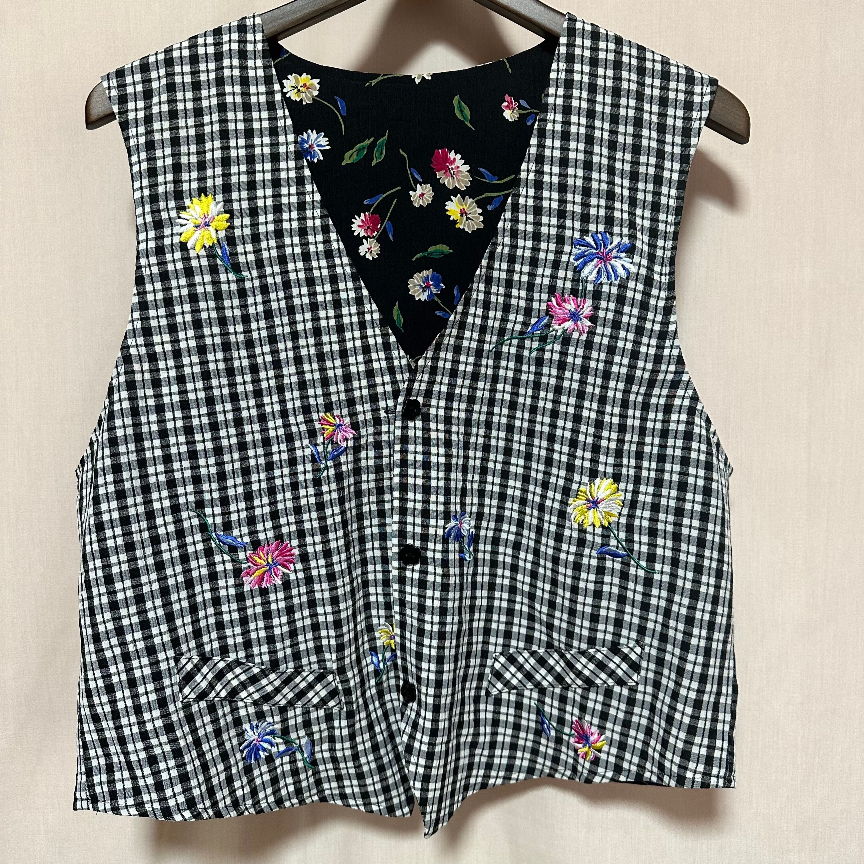 ◉オハナズキのリバーシブルベスト◉ 古着 黒 チェック 花 刺繍