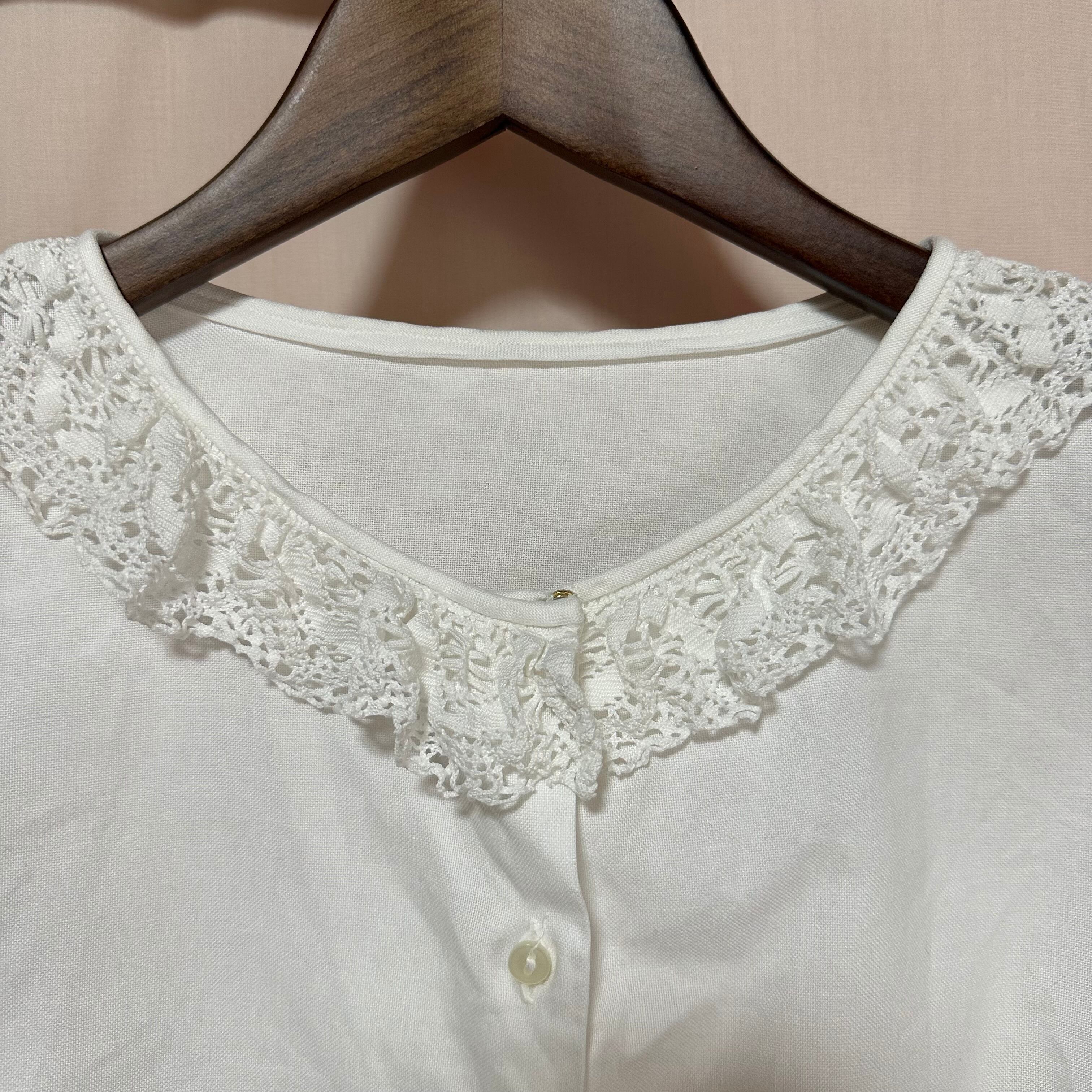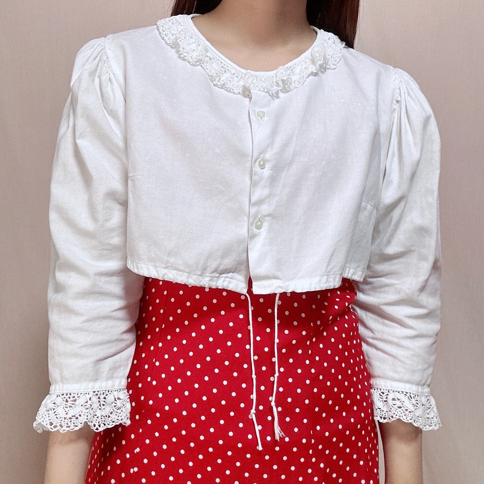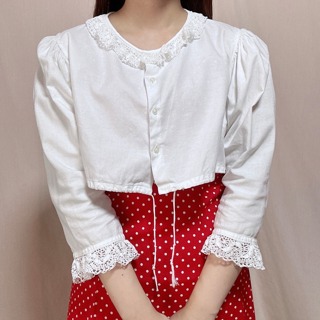 襟と袖の繊細なクロシェレースが可愛いクロップド丈のブラウスです。