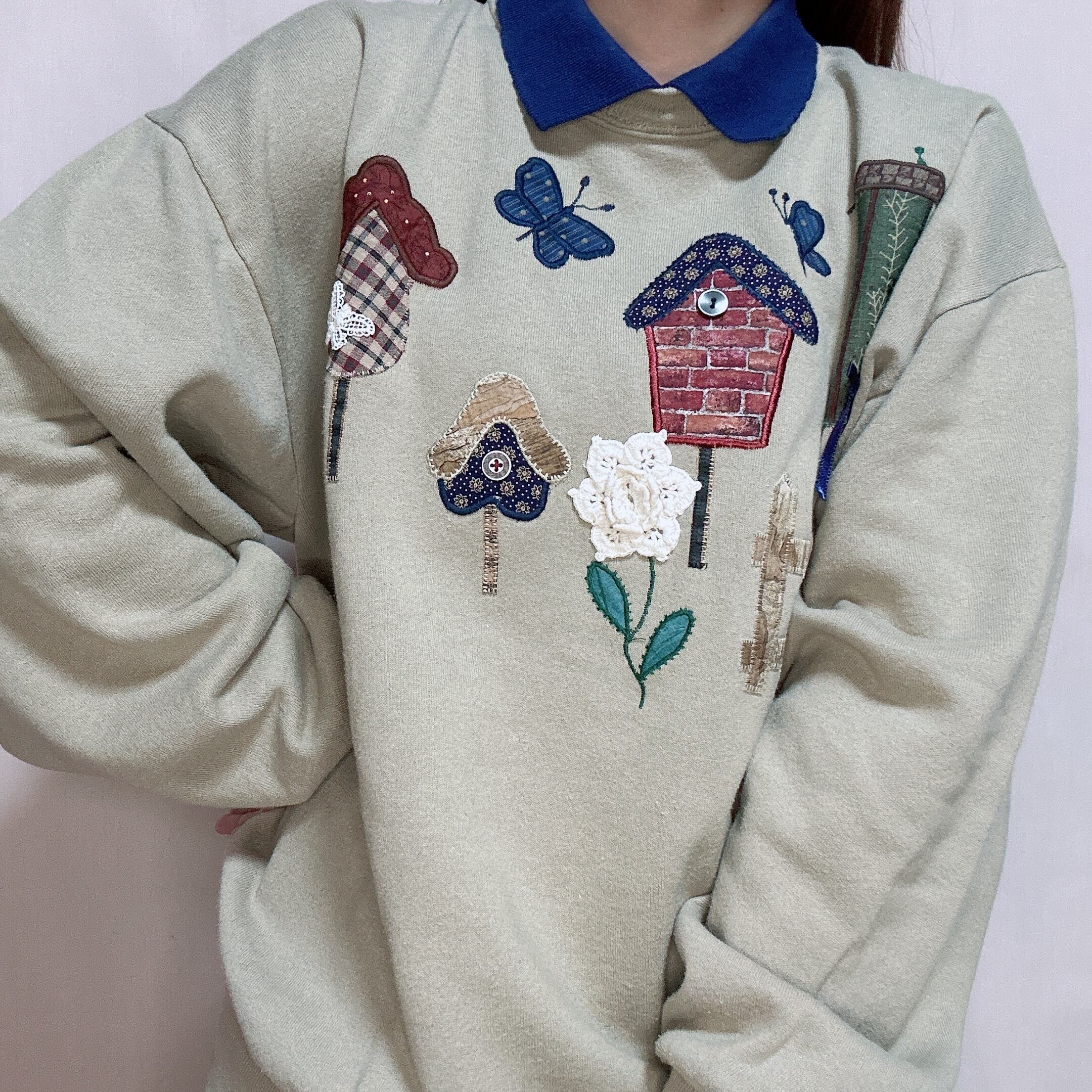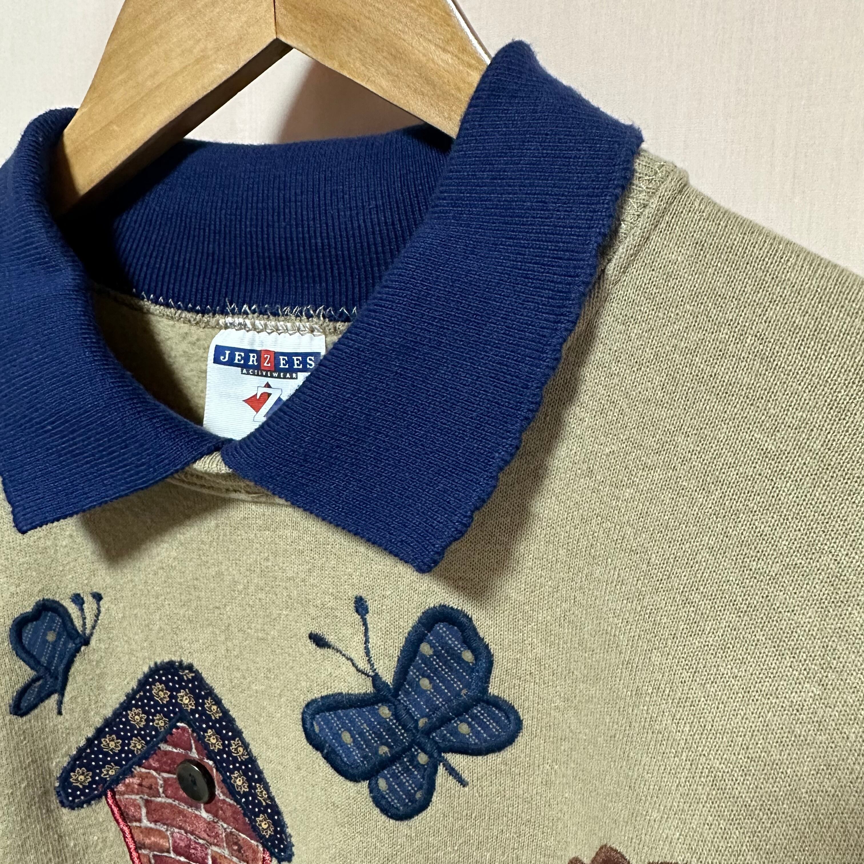 ◉オハナニアツマルチョウチョのエリツキスウェット◉ 古着 ベージュ ビッグサイズ