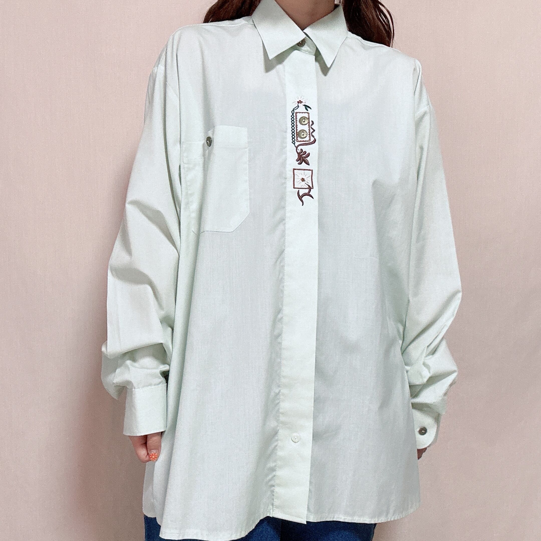 薄めな燻みグリーンカラーにお花モチーフの刺繍がポイントなシャツです。
